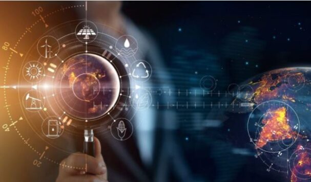 A person holds a magnifying glass over a digital globe with various futuristic icons and data graphics, suggesting technology, innovation, and global connectivity.